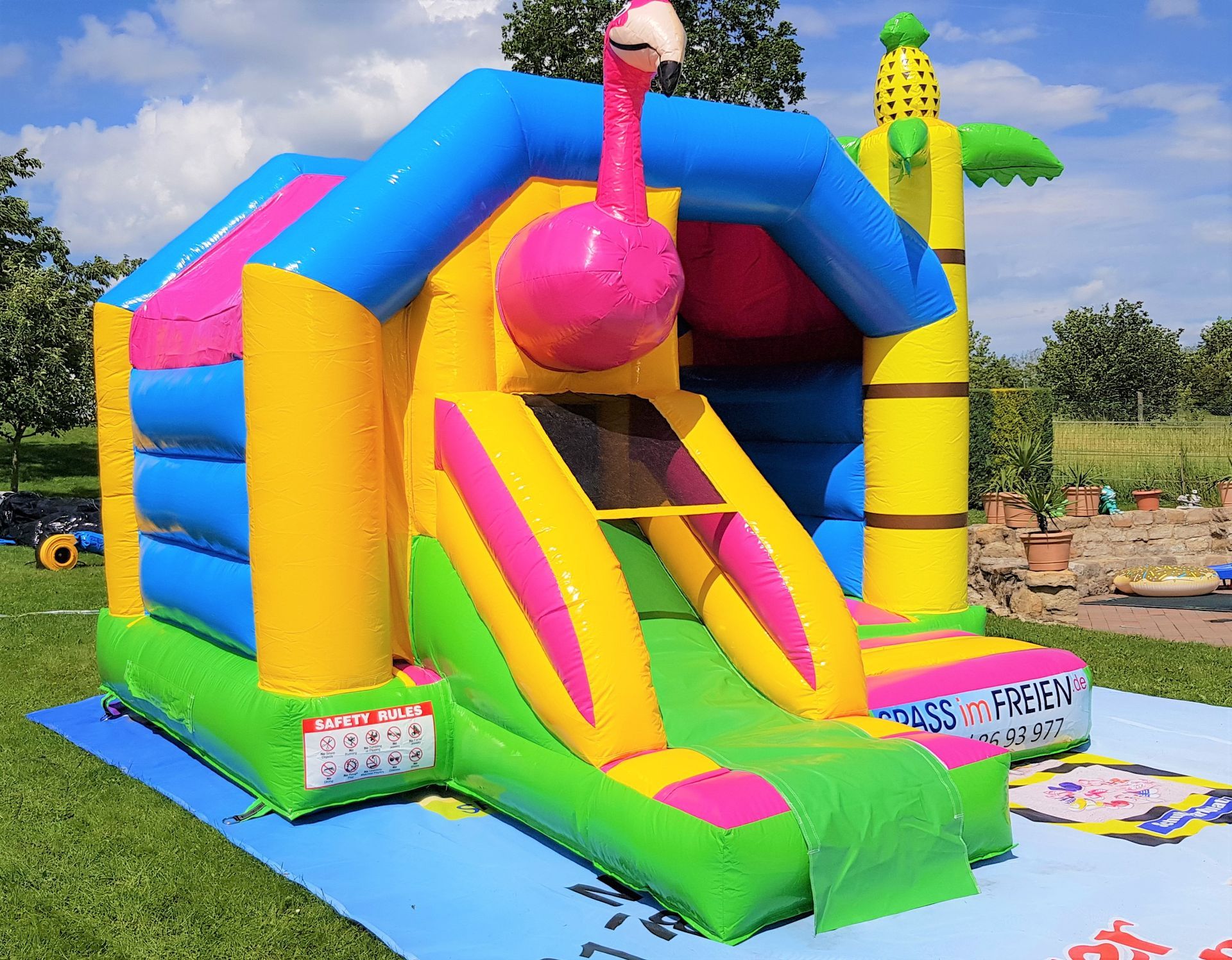 Es ist eine überdachte Hüpfburg mit wunderschönem Flamingo Motiv. Die Burg ist ca. 3,9m Breit und 4,9m lang somit hat sie eine Fläche von ca. 20m².Zudem ist die Rückwand im inneren noch mit einen sehr schönen Strand Motiv bedruckt.