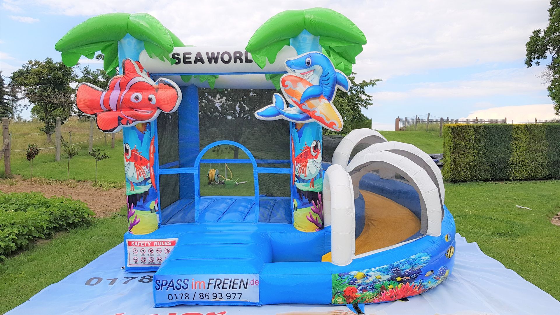 Diese Hüpfburg ist speziell für unsere kleinen Gäste konstruiert. Sie ist geeignet für Kinder bis ca 6 Jahre. Die Burg ist ca. 3,0m Breit und 3,9m lang somit hat sie eine Fläche von ca. 12m².Zudem ist die Rückwand noch mit einen sehr schönen Strand Motiv bedruckt.