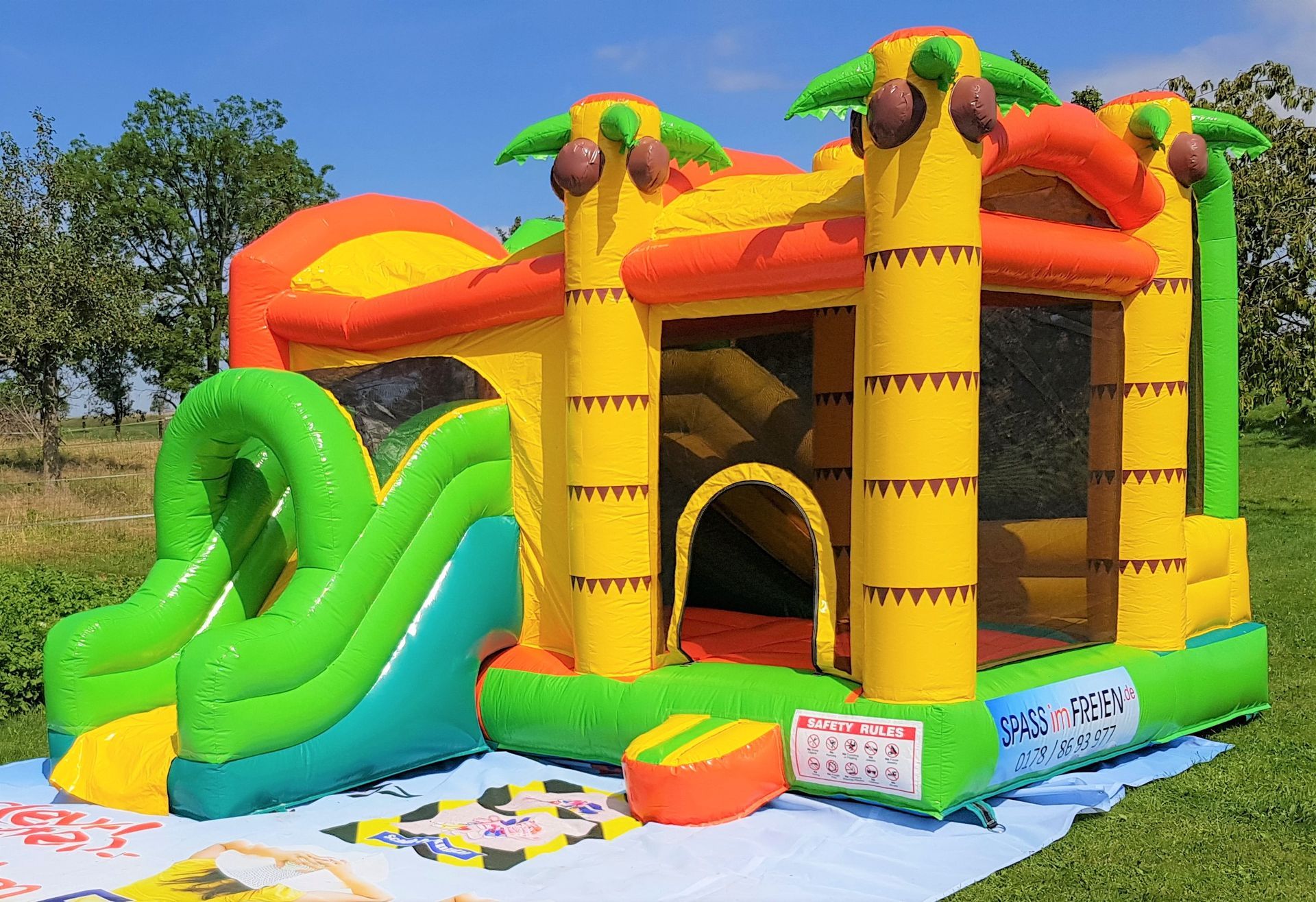 Wir haben hier eine sehr schöne farbenfrohe Hüpfburg in Strand Design. Hier hat man im Eingangsbereich ein Bällebad bevor es in die eigentliche Burg rein geht. Im inneren des Sicherheits Netzes haben wir eine Sprungfläche von der es auf die beiden Rutschen geht. Um auf die Rutschen zu kommen wurden extra Griffe verbaut sodas es auch kleine Kinder schaffen. Zudem hat diese Burg auch ein Dach was die Kinder beim spielen vor Sonne und Regen schützt.