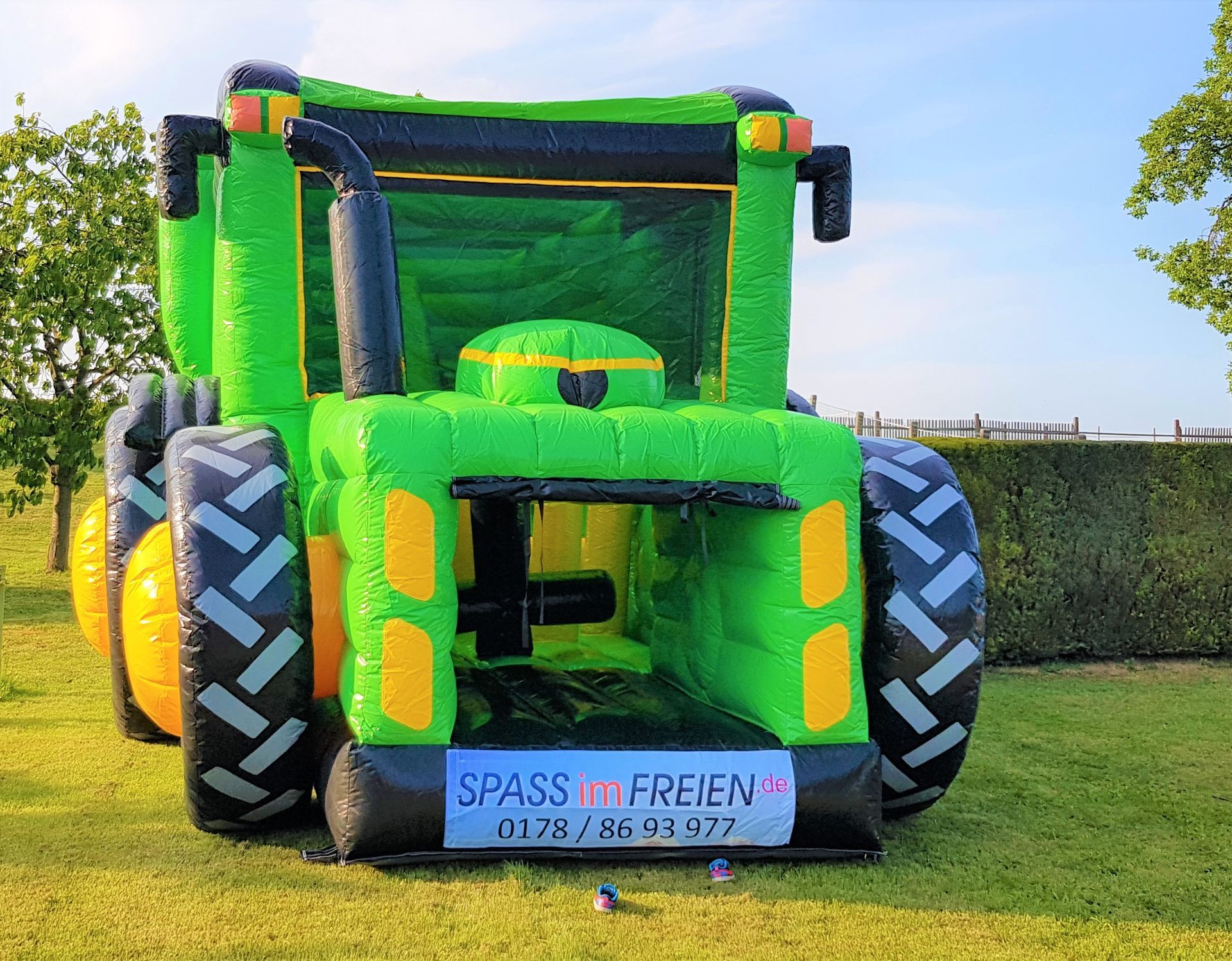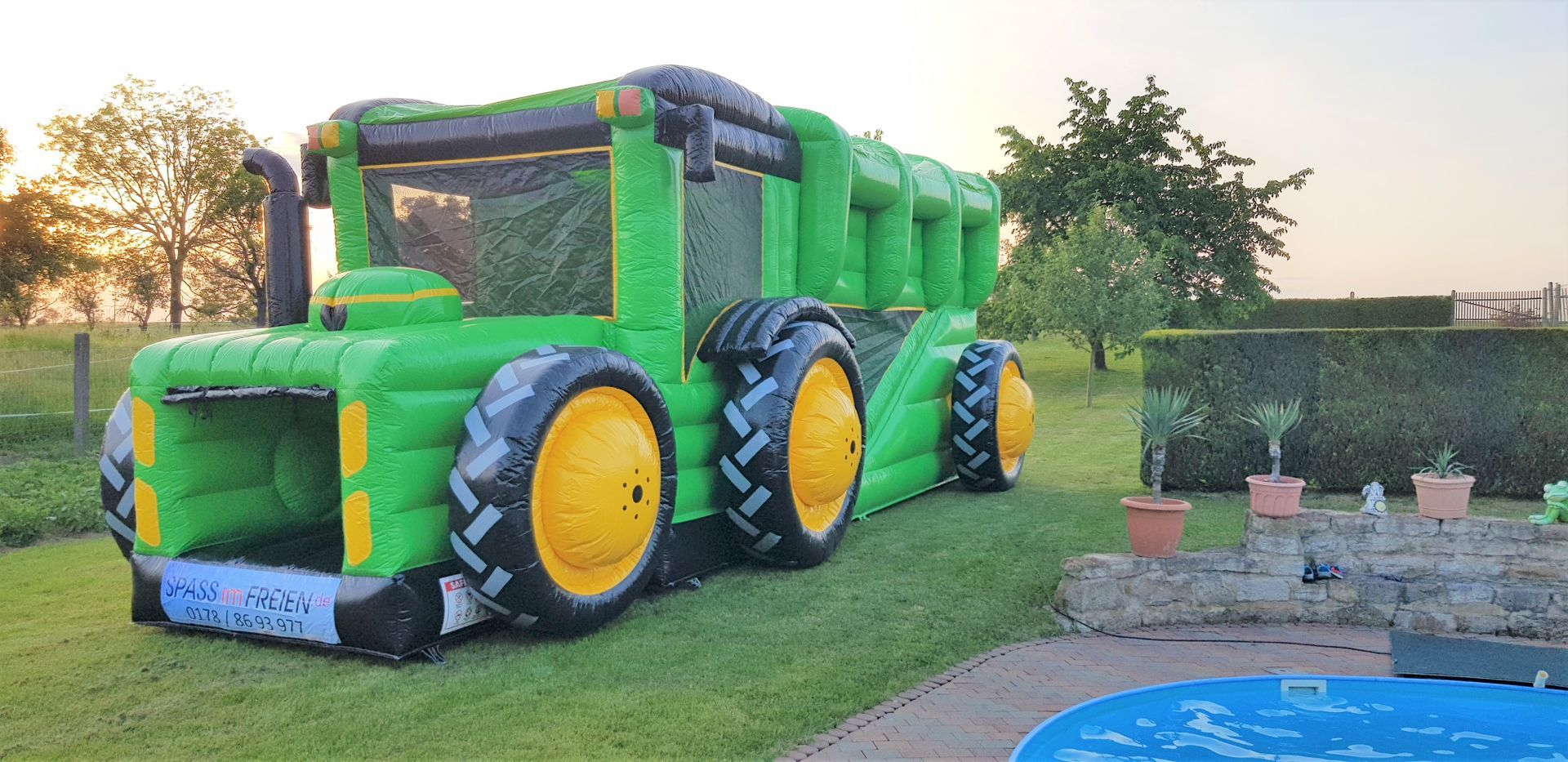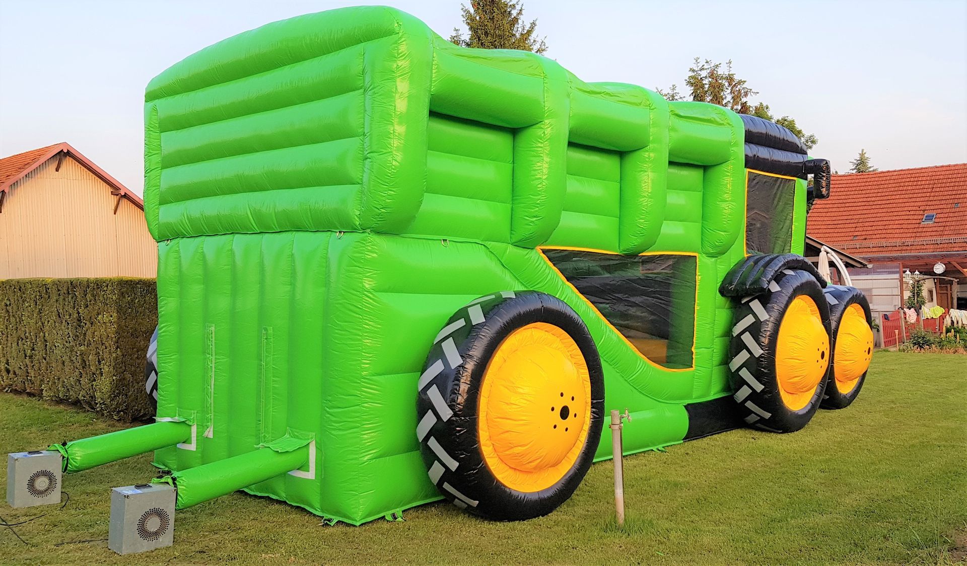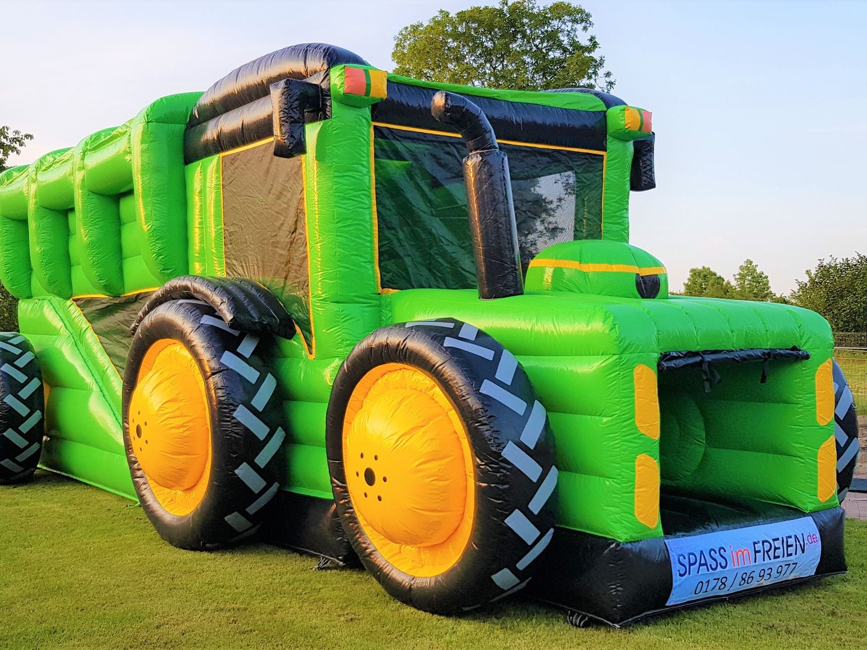 Die MultigameTraktor Hüpfburg darf auf keinem Hoffest, keiner Vereinsfeier und keinem Stadtfest fehlen! Sie überzeugt durch das riesige Schlepper Gespann Design und ist der realität sehr nahe. Im Inneren des Traktors befinden sich zahlreiche Hindernisse und am Ende im Anhänger ist noch eine riesen Rutsche verbaut. Durch die Netzte an der Seite, bleiben die Kinder immer im Blickfeld der Aufsichtspersonen.