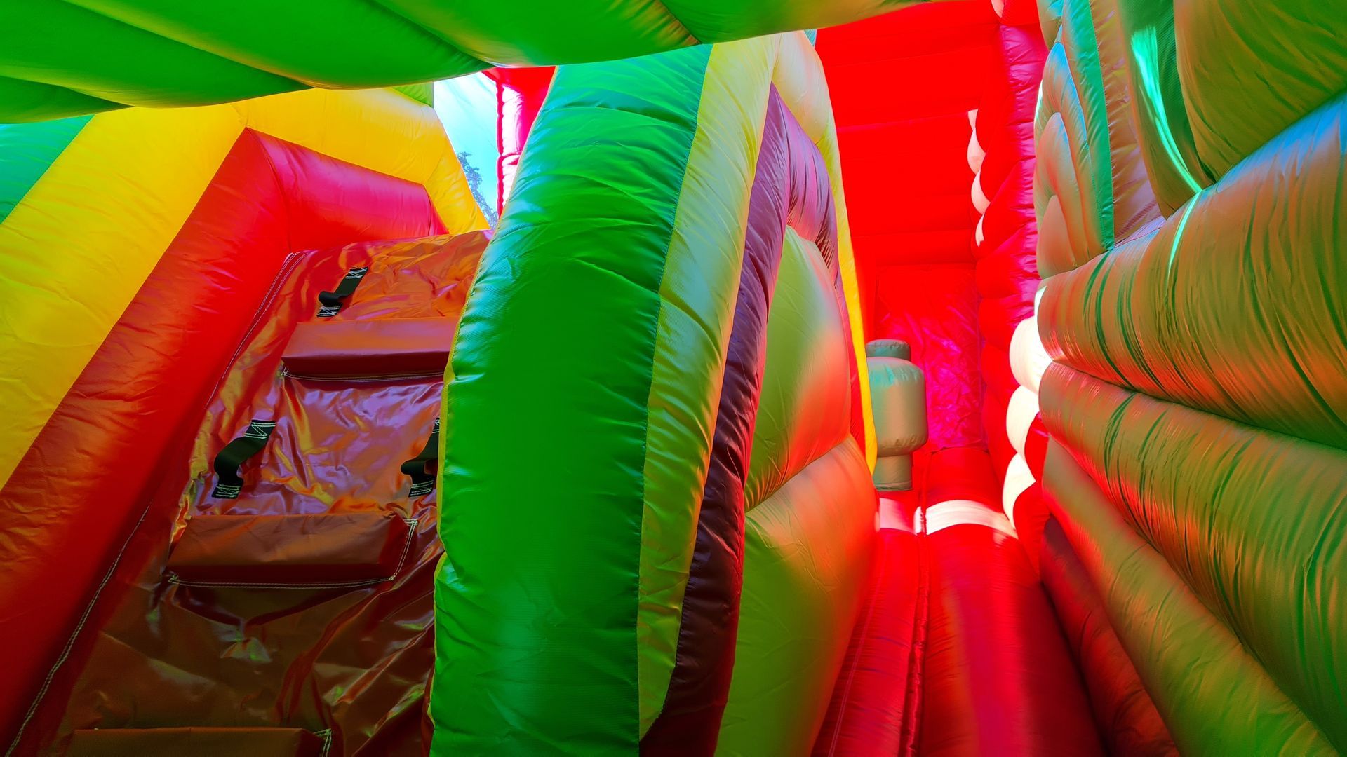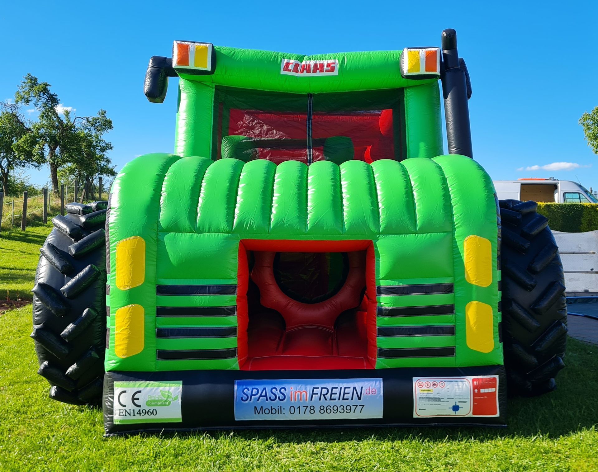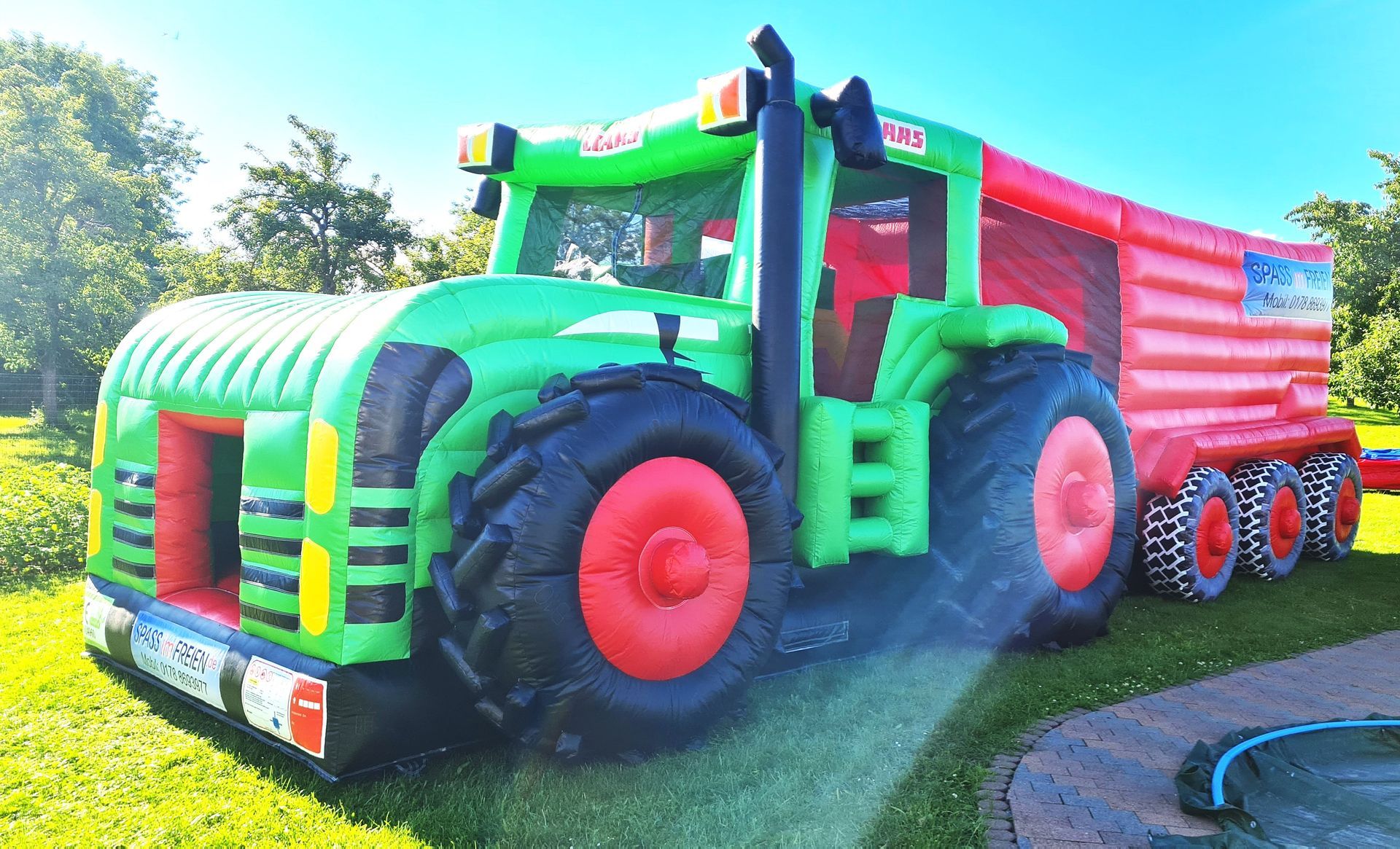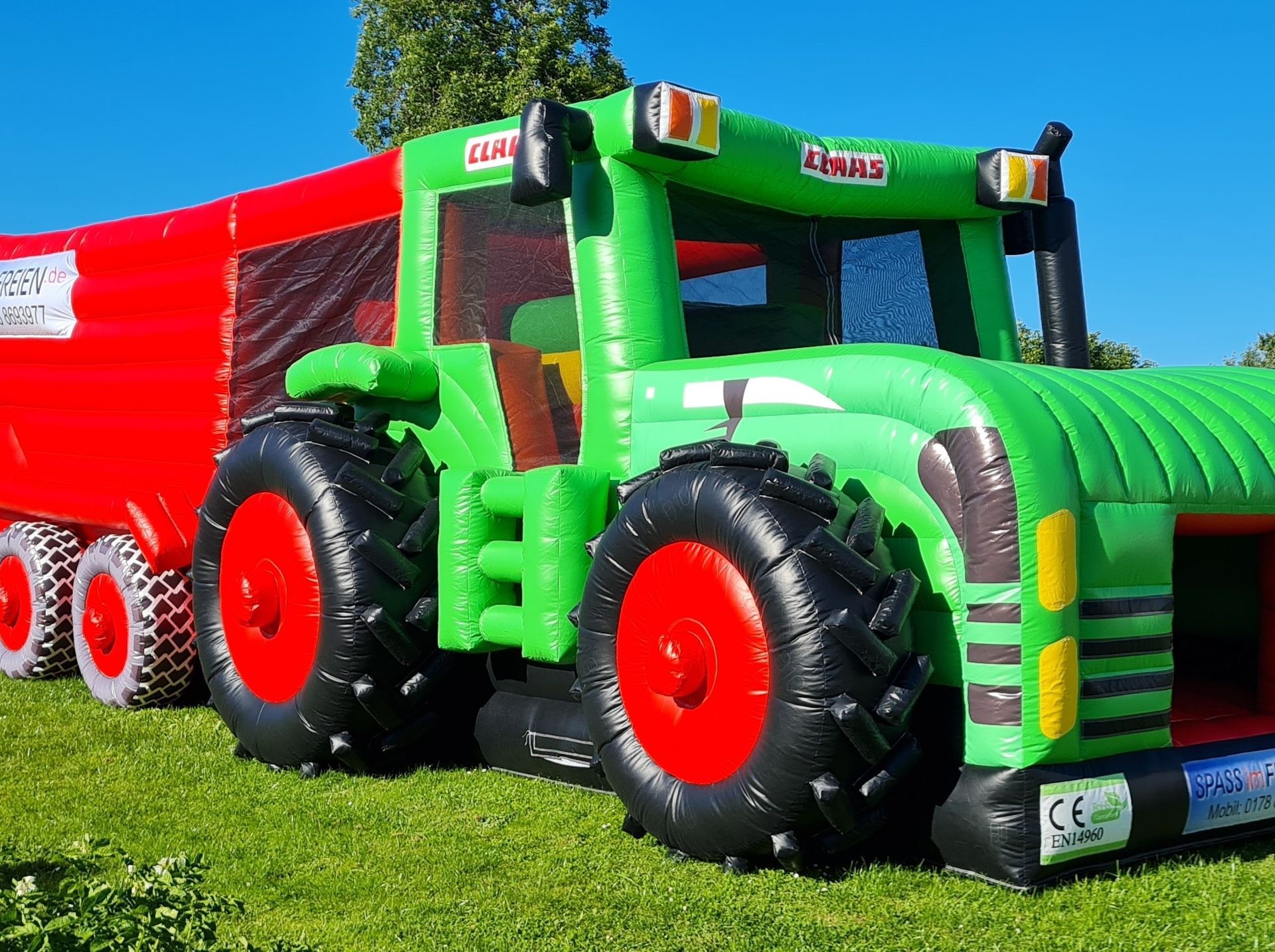Die MultigameTraktor Hüpfburg darf auf keinem Hoffest, keiner Vereinsfeier und keinem Stadtfest fehlen! Sie überzeugt durch das riesige Schlepper Gespann Design und ist der Realität sehr nahe. Im Inneren des Traktors befinden sich zahlreiche Hindernisse, eine kleinere Rutsche und am Ende im Anhänger ist noch eine riesen Rutsche verbaut. Durch die Netzte an der Seite, bleiben die Kinder immer im Blickfeld der Aufsichtspersonen.