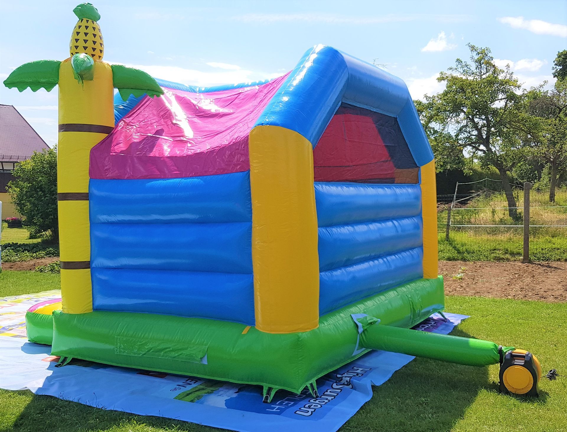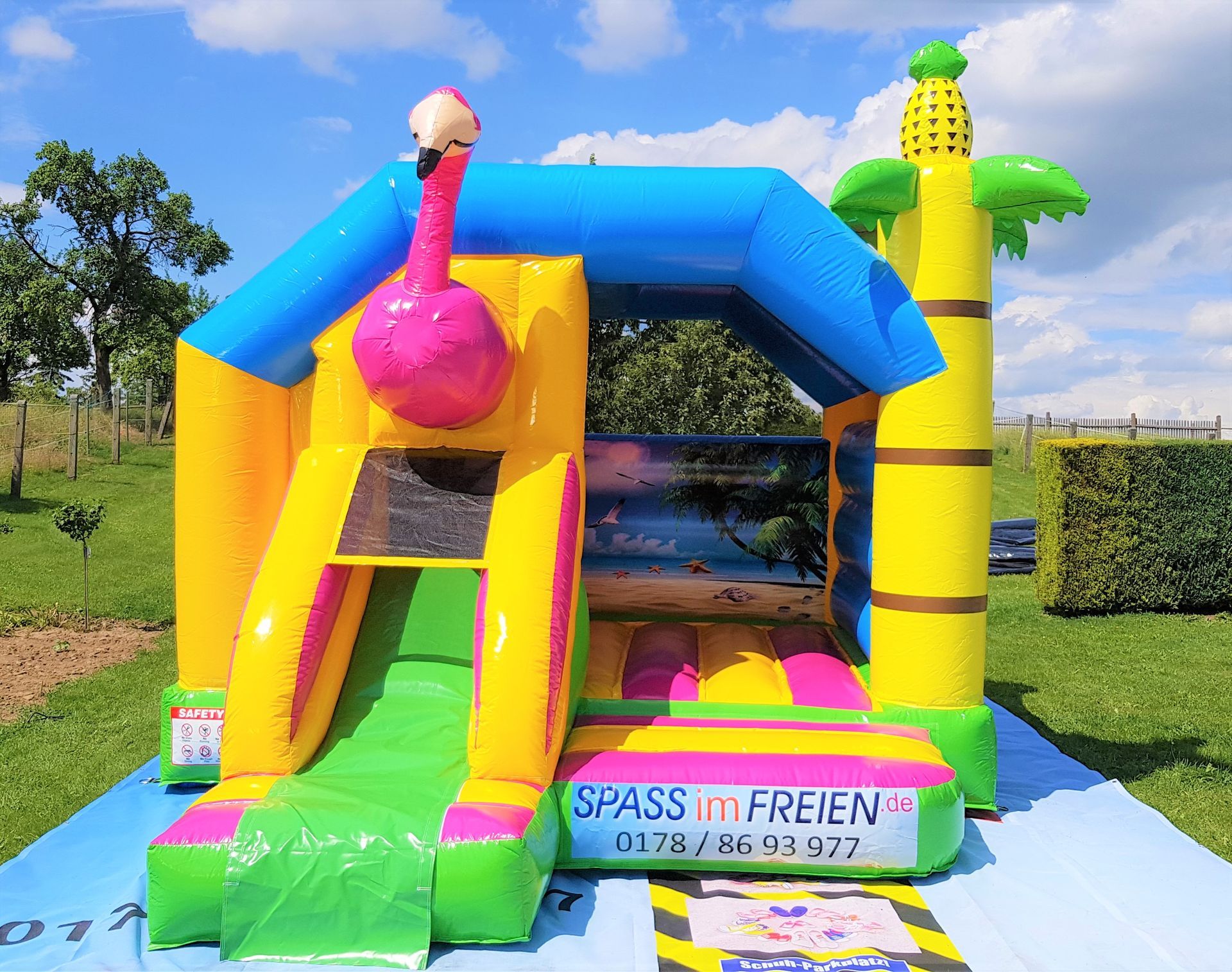 Es ist eine überdachte Hüpfburg mit wunderschönem Flamingo Motiv. Die Burg ist ca. 3,9m Breit und 4,9m lang somit hat sie eine Fläche von ca. 20m².Zudem ist die Rückwand im inneren noch mit einen sehr schönen Strand Motiv bedruckt.