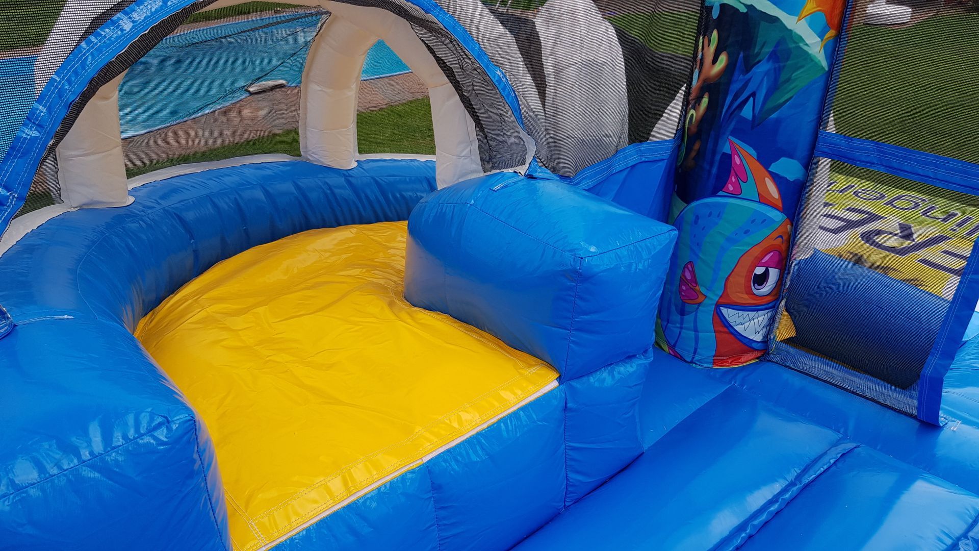 Diese Hüpfburg ist speziell für unsere kleinen Gäste konstruiert. Sie ist geeignet für Kinder bis ca 6 Jahre. Die Burg ist ca. 3,0m Breit und 3,9m lang somit hat sie eine Fläche von ca. 12m².Zudem ist die Rückwand noch mit einen sehr schönen Strand Motiv bedruckt.